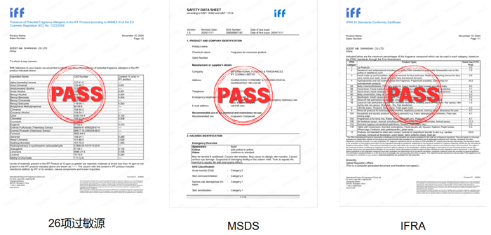 与传统香氛不同,车规级香氛发生器要求从香精原料到香氛,最后到成品香氛棒都必须经过多项安全试验验证测试。香精原料必须取得IFRA(国际日用香料香精协会安全证书)、MSDS(学品安全技术说明书)和Allergens(过敏原检测合格)三项权威安全认证证书,并且要给予不含甲醛的声明,确保原材料的安全健康。腾博会光电依据主机厂标准,精选合作香精公司的优质原料,均满足IFRA、MSDS、Allergens三项权威认证,确保香精安全健康。